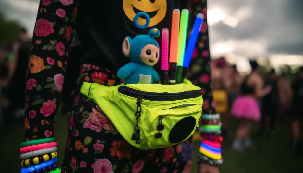 Beyond clothing, the rave scene spawned a whole new world of accessories. Fanny packs and backpacks in every neon color imaginable became the go-to bag for carrying essentials while dancing. Surprisingly, the brightly colored characters from Teletubbies were adopted as ironic rave mascots, appearing on everything from glowsticks to plush toys. The playful incongruity perfectly captured the spirit of the scene’s playful rebellion.